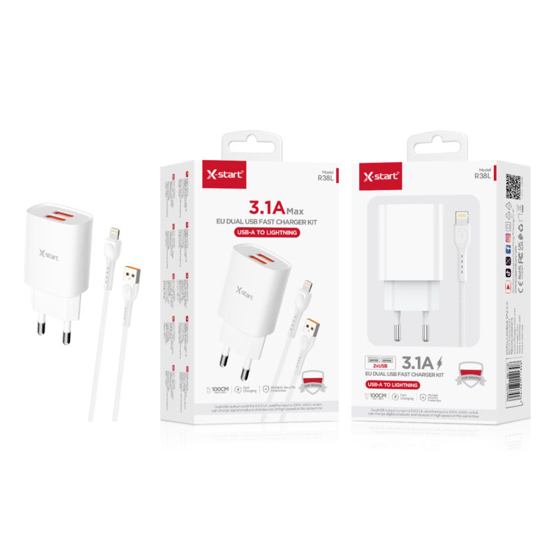 R38L 充电套装White 3.1A EU Charging Kit, 2xUSB-A/1M Cable, with (USB-A to Lightning) Cable, ABS Fire-Retardant Shell.