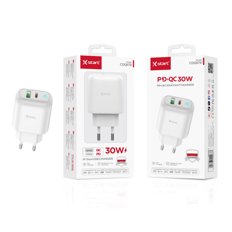 CDQ076 快速充电器White 30W EU Fast Charger 2x (USB-A + USB-C) ABS Fire-Retardant Shell