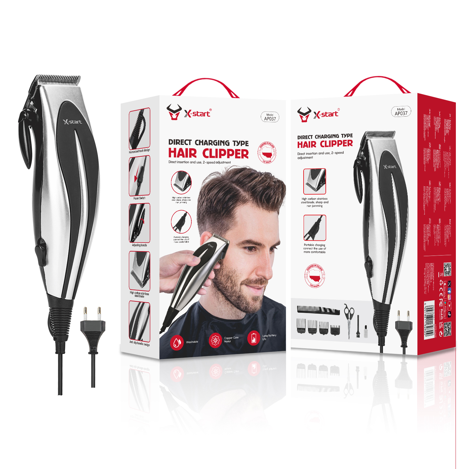 AP037 Black & Silver Home Electric Hair Clipper, Pure Copper Brushless Motor, 100V~250V/50~60Hz, High Carbon Stainless Steel Blade Head, 1.6m Cord, EU Plug, ABS Shell