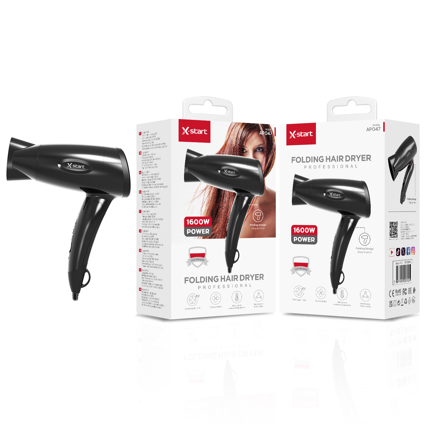 AP047 White/Silver Household Folding Hot Air Hair Dryer, 1600W, 2-Speed ​​Constant Temperature, 1.8m Cord, 220V~240V, 50/60Hz, ABS Shell