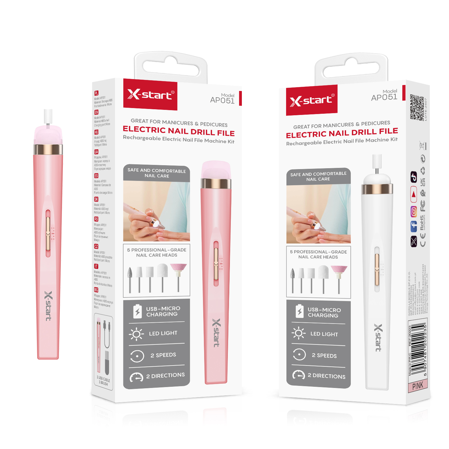AP051 Pink Electric Nail Filer with Fine Abrasive Ball, DC 5V Micro Charging Port, 360° Radiation Protection, Two Speed Settings, White Fluorescent LED, ABS Shell