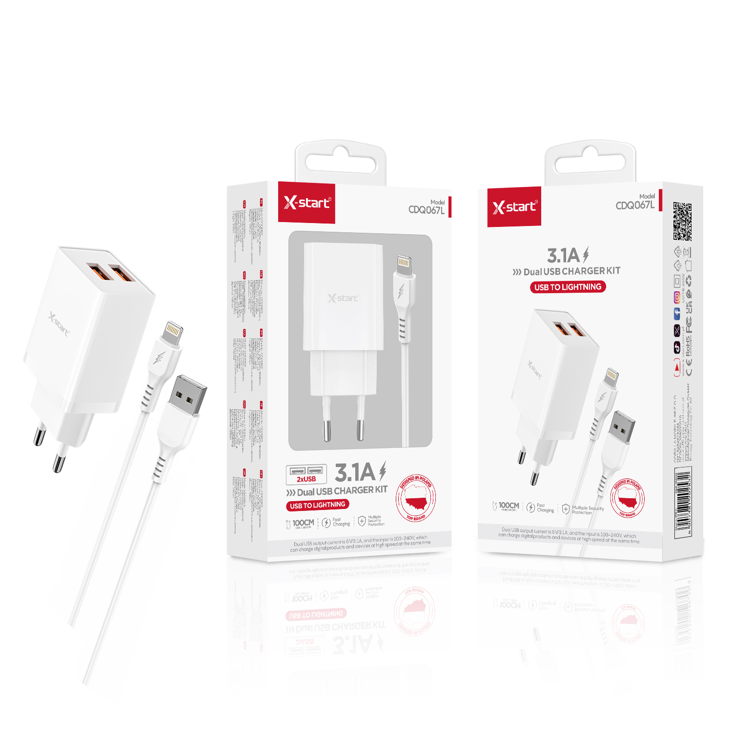 CDQ067L 家充套装White 3.1A EU Home Charger Kit, 1M Cable, 2 USB Ports with (USB-A to Lightning) Cable, ABS Fire-Retardant Shell.