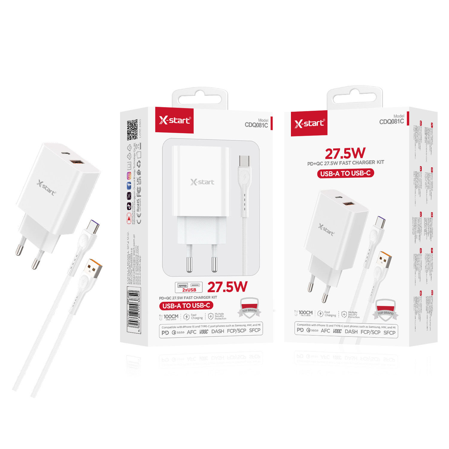 CDQ081C 快充套装 White 27.5W EU Fast Charging Kit, 1M Cable, 2x (USB-A + USB-C), with (USB-A to USB-C) Cable, ABS Fire-Retardant Shell.