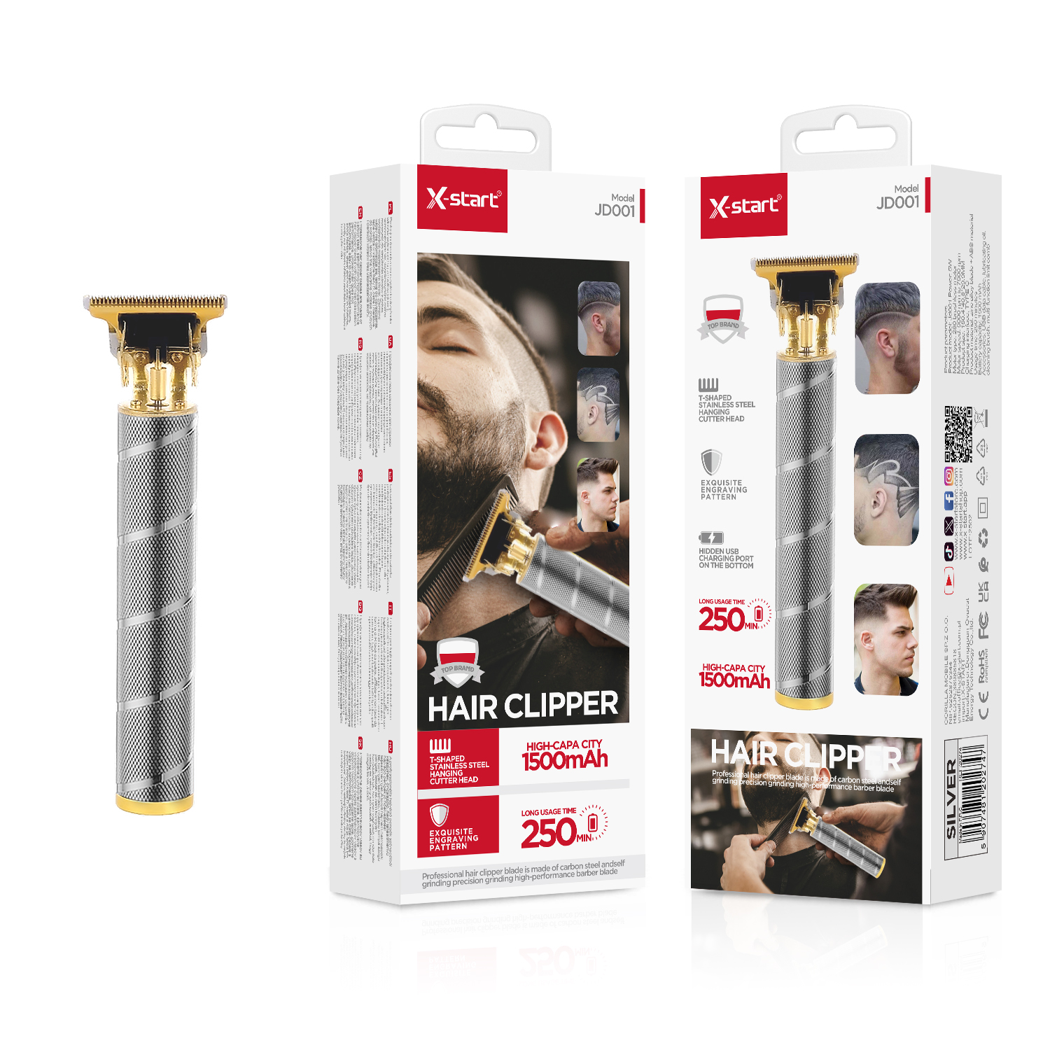 JD001 Silver Electric Hair Clipper, 5W, 180Hz Brushless Motor, 5000-7500 RPM, Micro 3.7V/1500mAh, Zinc Alloy Material