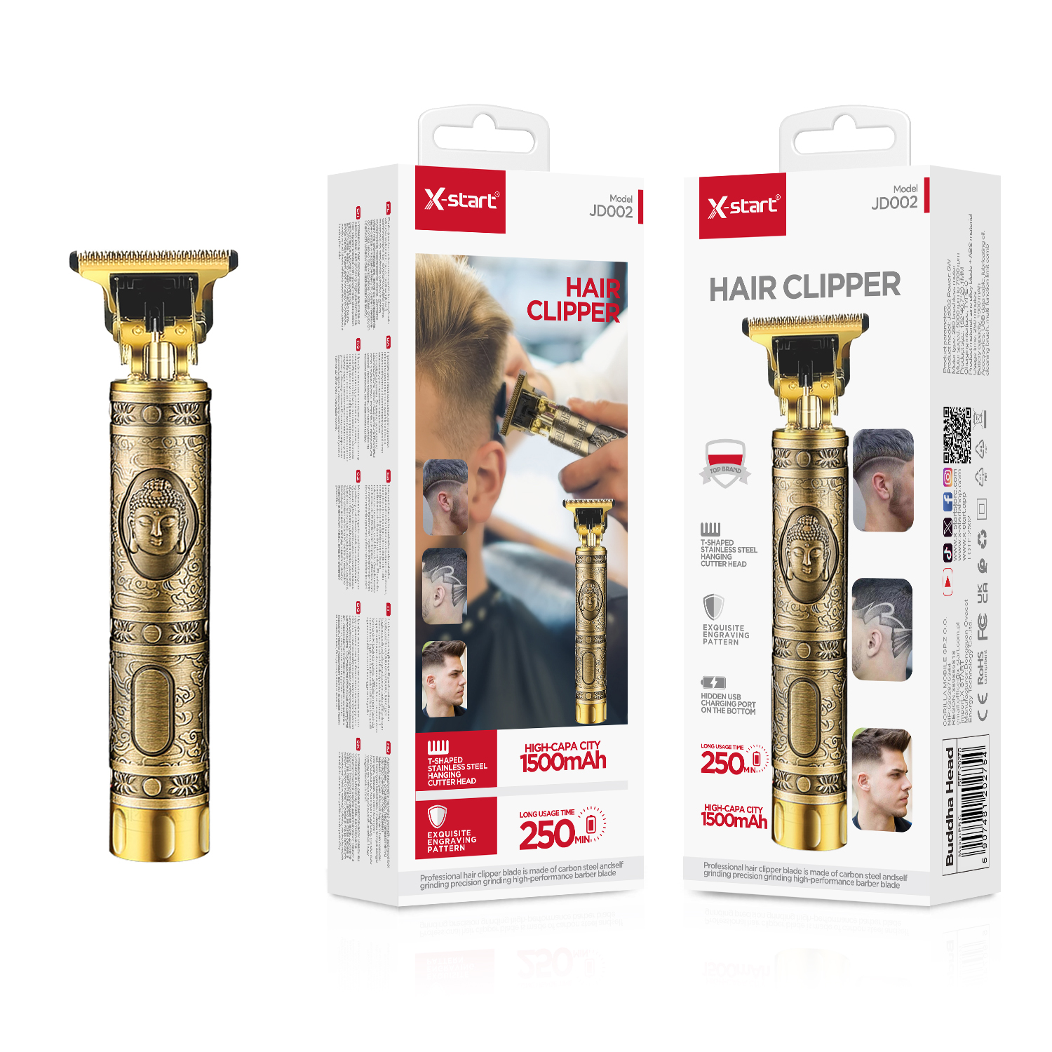 JD002 佛头款电动理发器 Gold Direct-Charging Buddha Head Electric Hair Clipper 5W 180Hz Brushless Motor 5000~7500rpm Micro 3.7V/1500mAh Zinc Alloy Material
