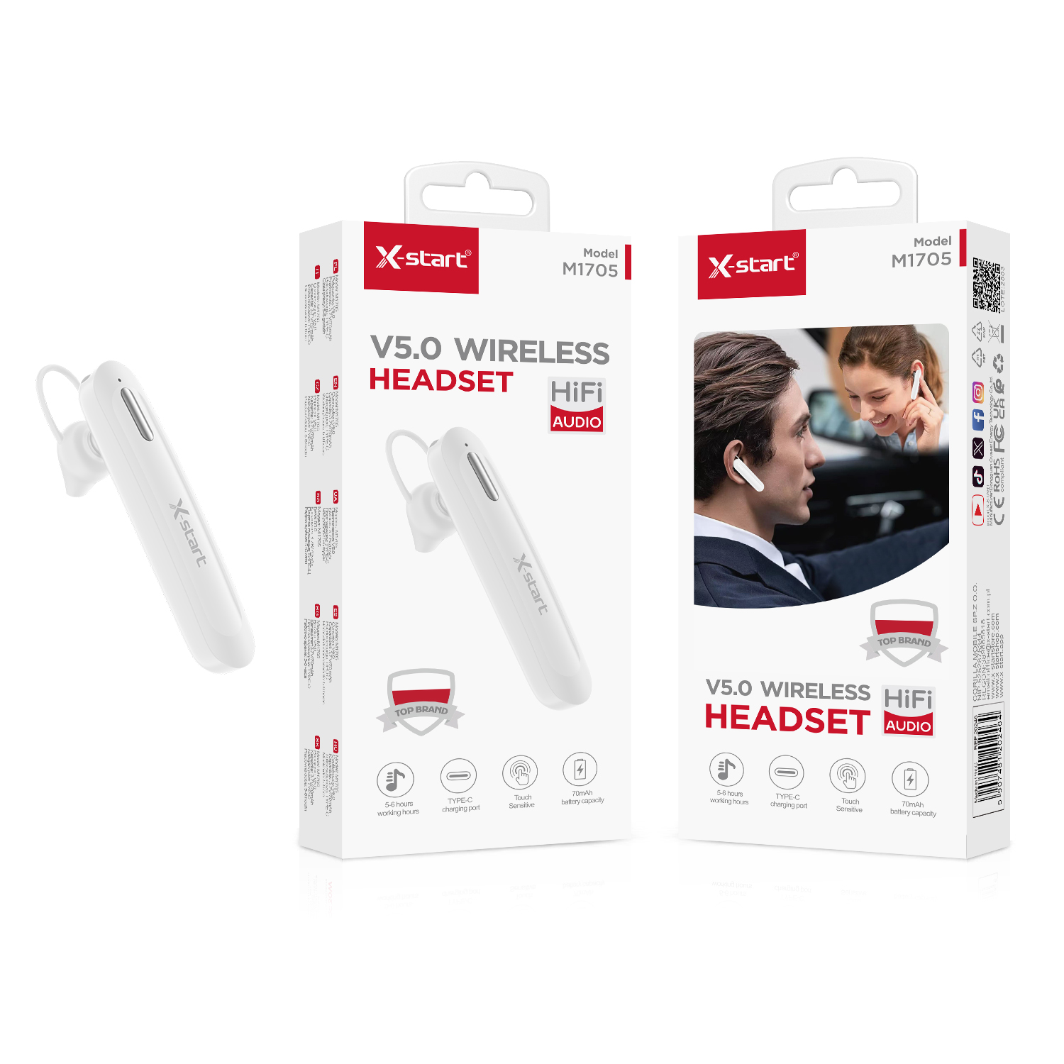 M1705 White Single-Ear Bluetooth Earphone V5.0 3.7V/70mAh TYPE-C ≥10m 20Hz-20KHz ABS Shell