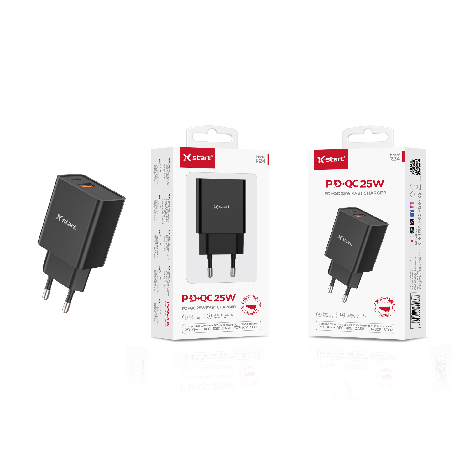 R24 快速充电器Black 25W EU Fast Charger 100V~240V, 50/60Hz 2x(USB-A)+(USB-C) ABS Shell