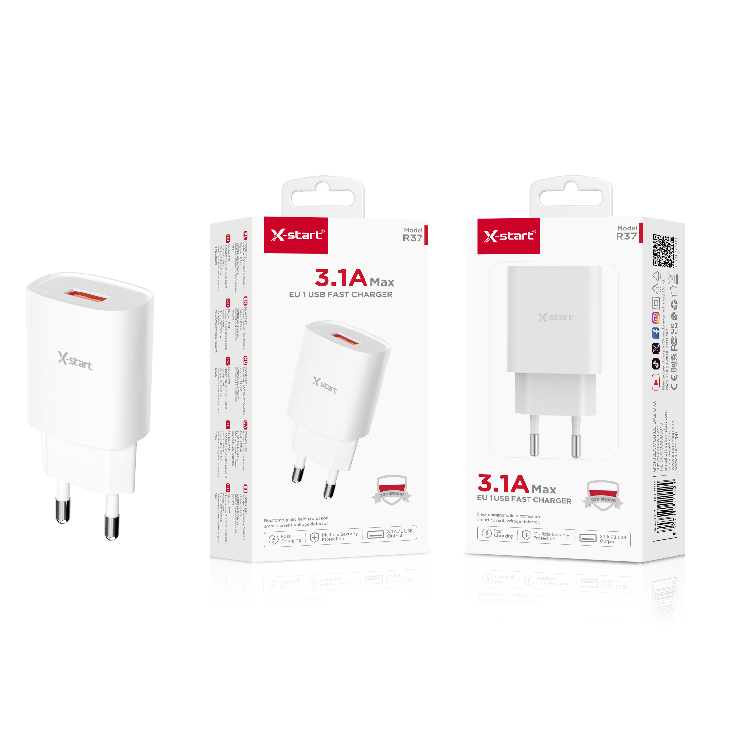 R37 家用充电器White 3.1A EU Home Charger, Single USB-A, ABS Fire-Retardant Shell