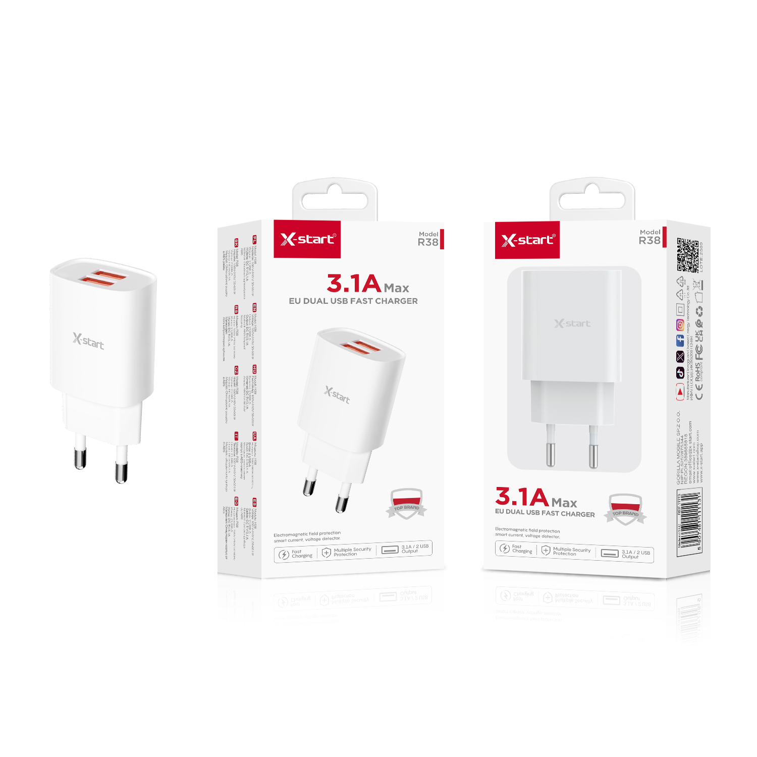 R38 家用充电器White 3.1A EU Home Charger with 2 x USB-A USB-A and ABS Fire-Retardant Shell
