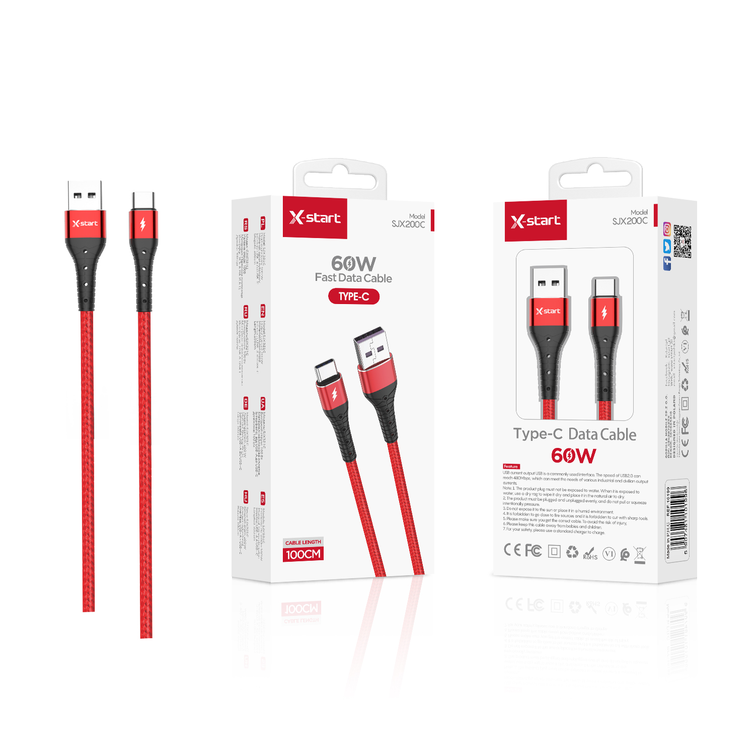 SJX200C 快充数据线Red 60W Braided Fast Charging Data Cable, 1M Length, Braided Outer Sheath, USB-A to USB-C