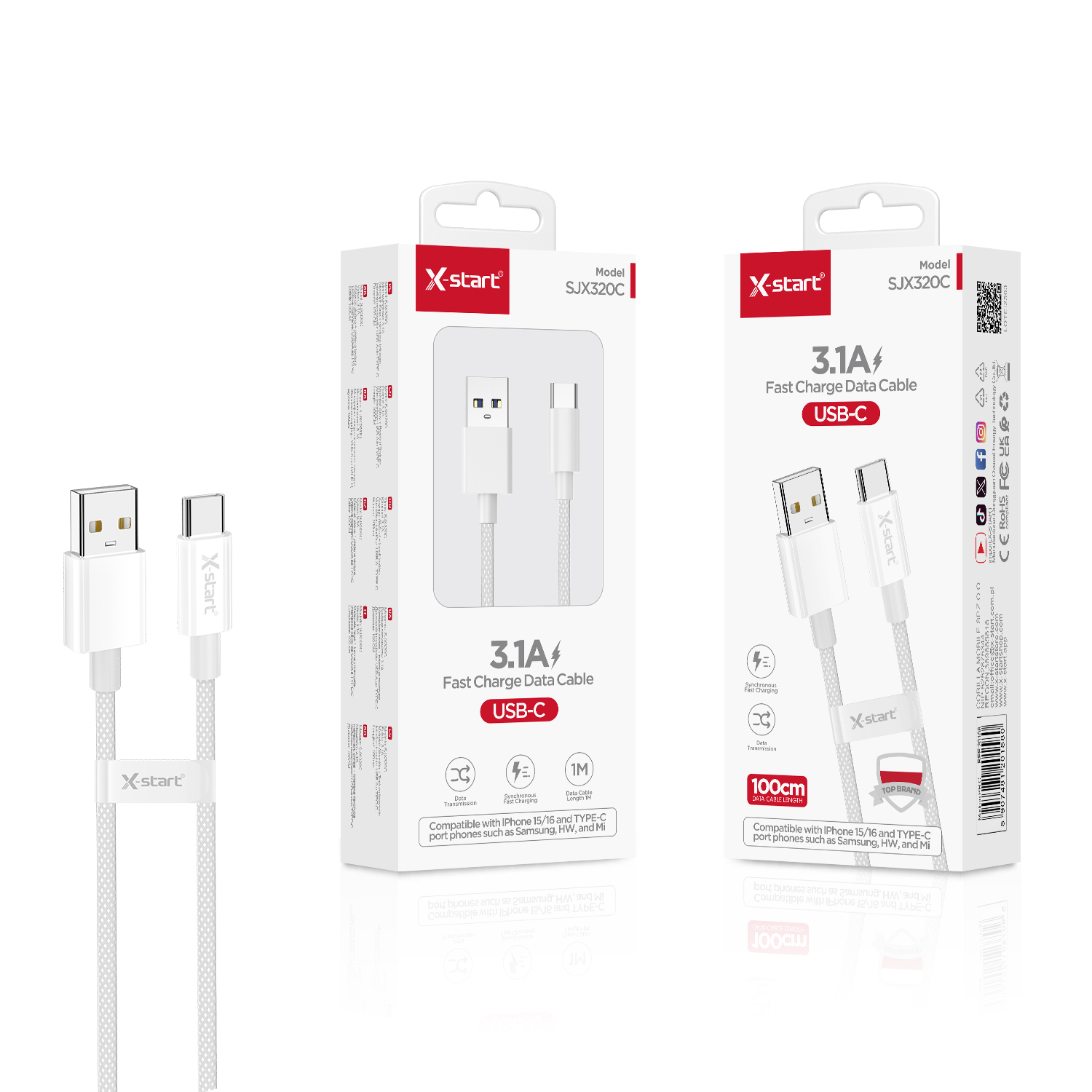 SJX320C 快充数据线White 3.1A Fast Charging Data Cable, 1M USB-A to USB-C, Braided Sheath