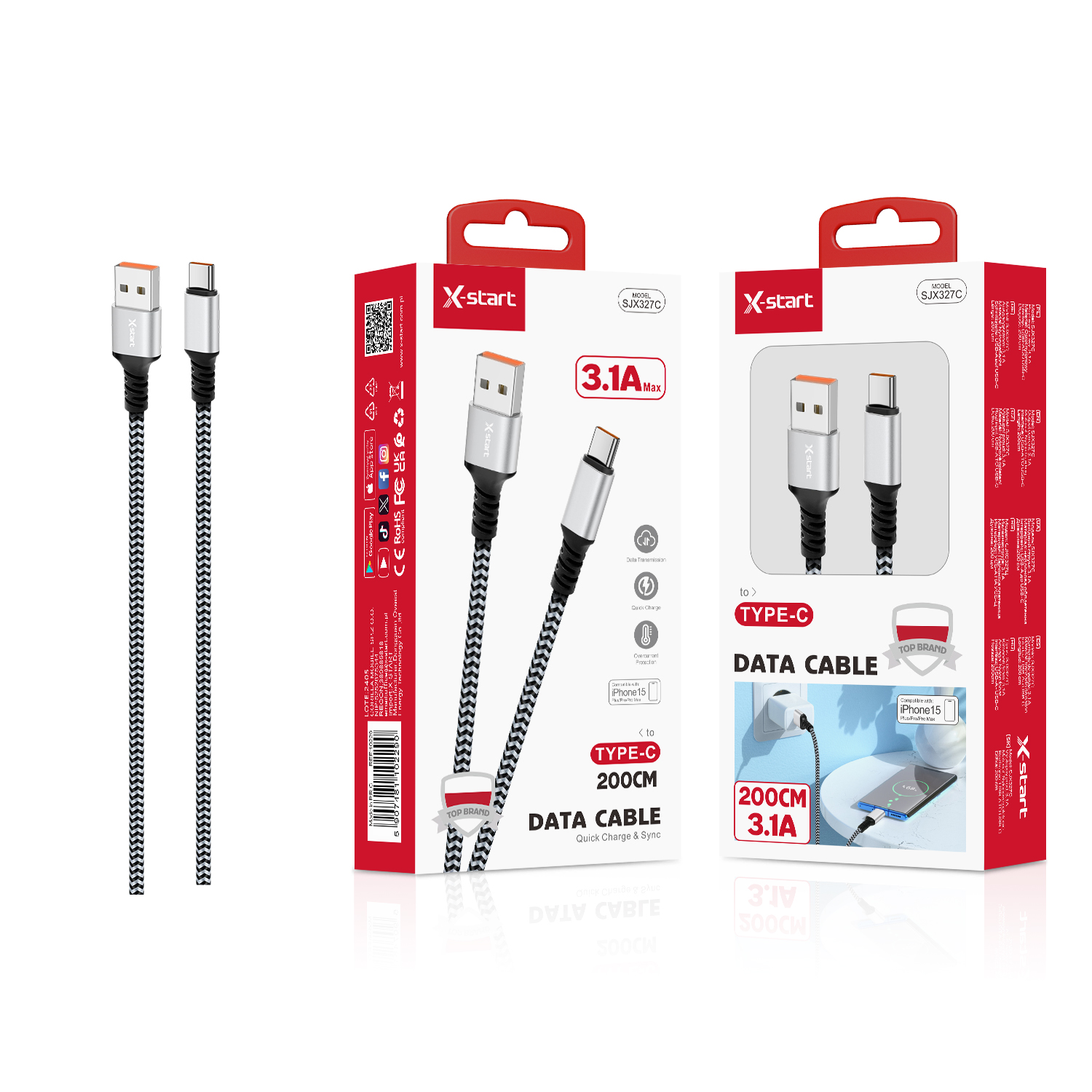 SJX327C 编织快充数据线Black/Silver 3.1A Braided Fast Charging Data Cable 2M USB-A to USB-C Braided Outer Sheath