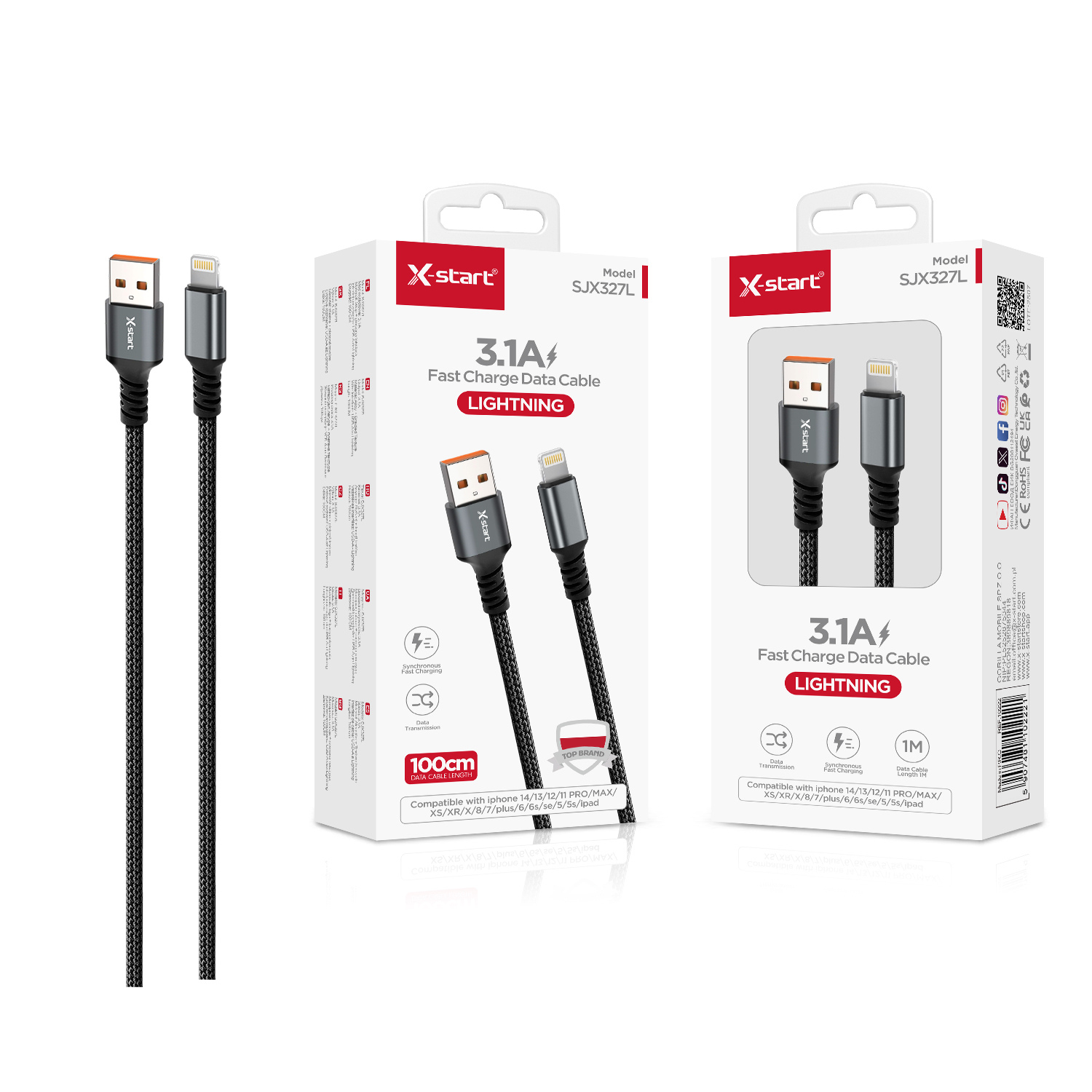 SJX327L 编织快充数据线Black/Silver 3.1A Braided Fast Charging Cable, 1M USB-A to Lightning, Braided Outer Sheath
