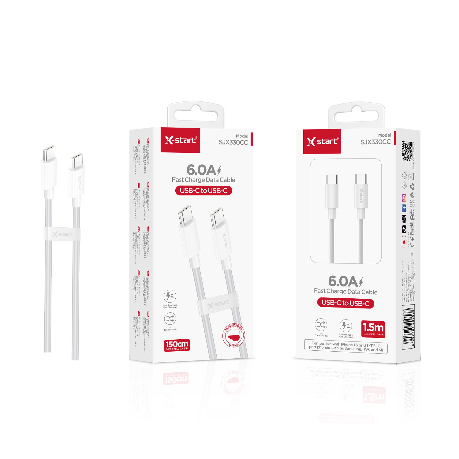 SJX330CC 快充数据线White 6.0A Fast Charging Data Cable 1.5M USB-C TO USB-C PVC Outer Sheath