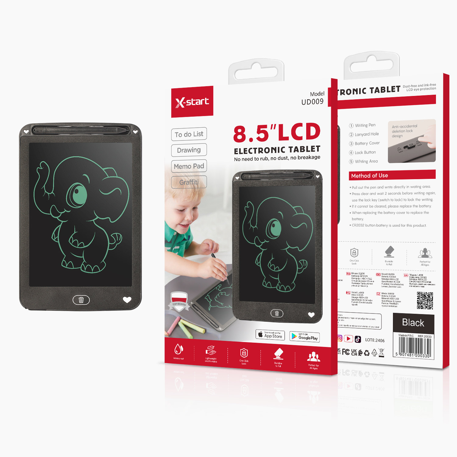 UD009 Black Rounded Edge LCD Electronic Writing Tablet LCD Screen CR2025 8.5-inch Monochrome Pen ABS Shell