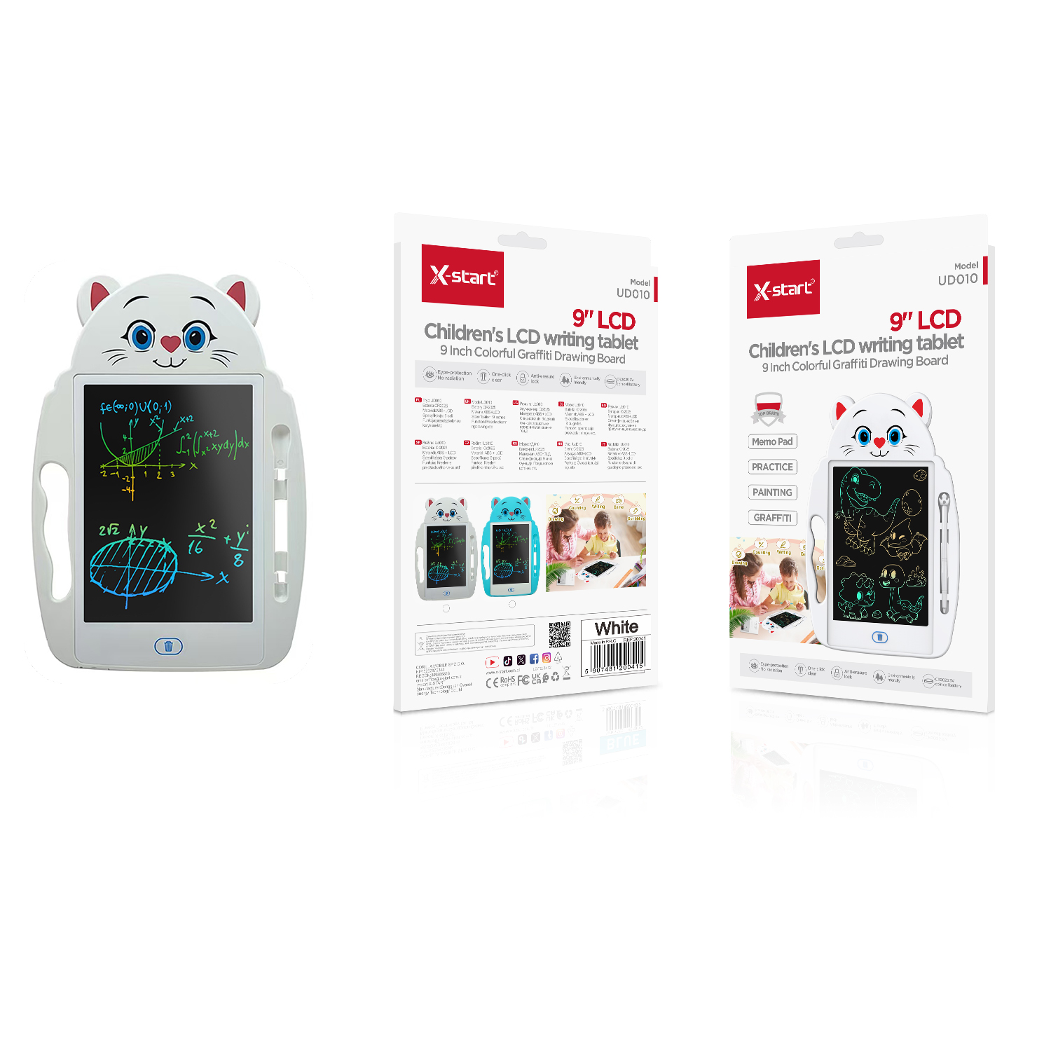 UD010 White Cartoon Cat LCD Electronic Writing Tablet, CR2025 9-inch LCD Screen, Colored Pen, ABS Shell