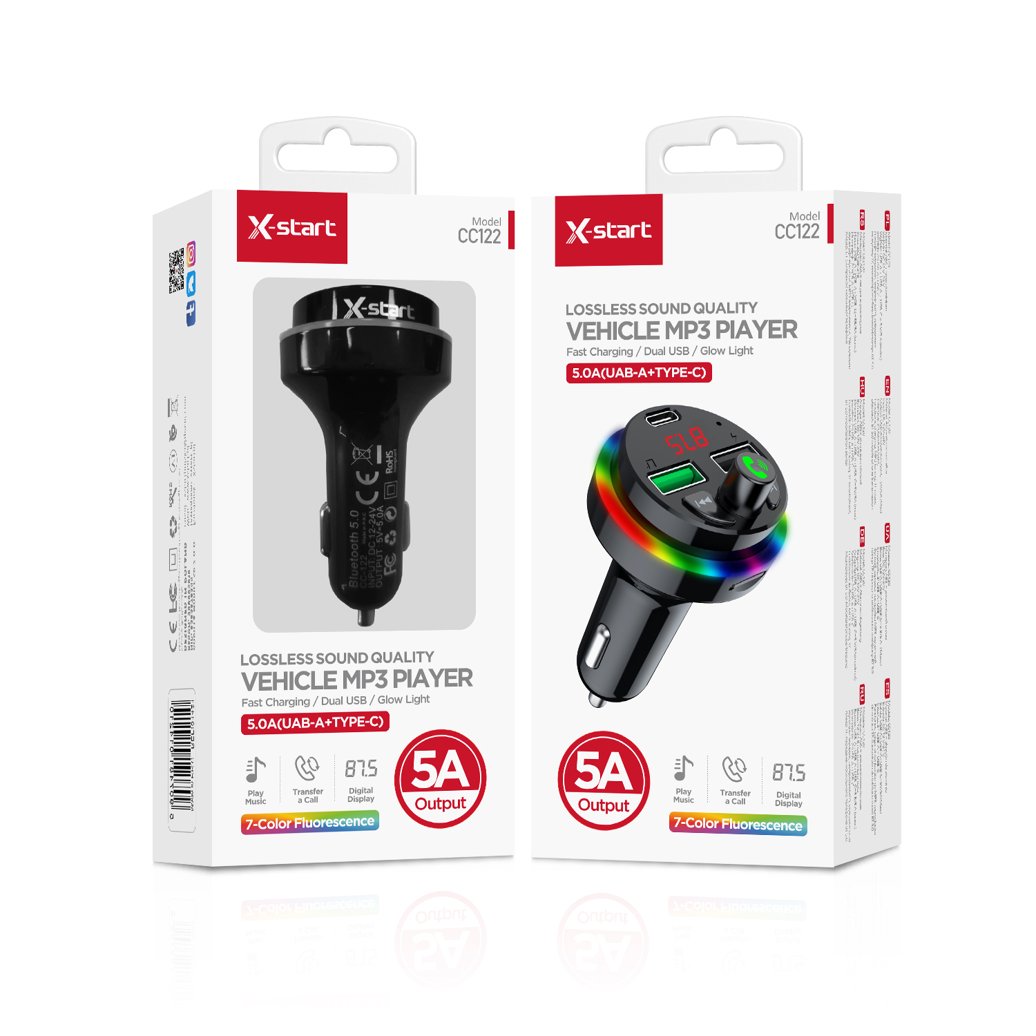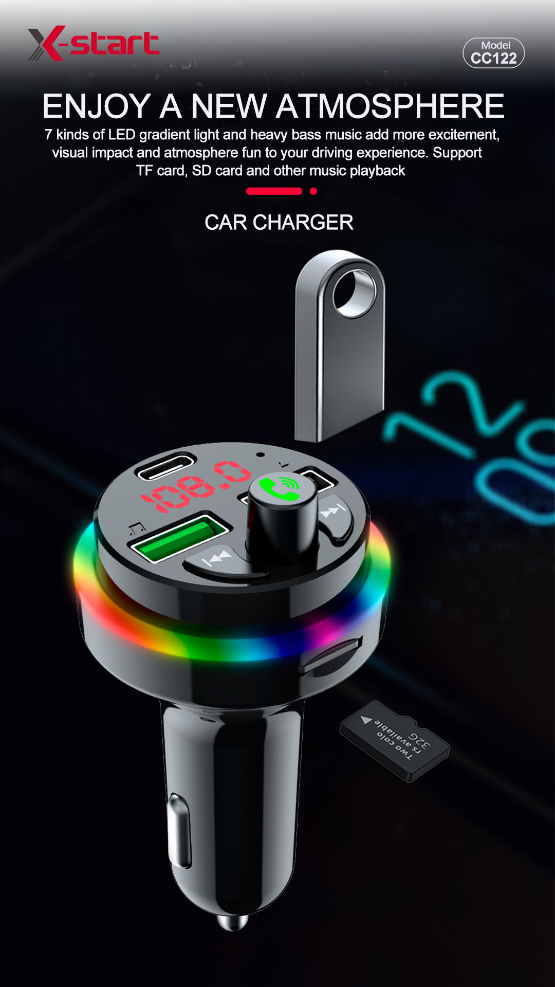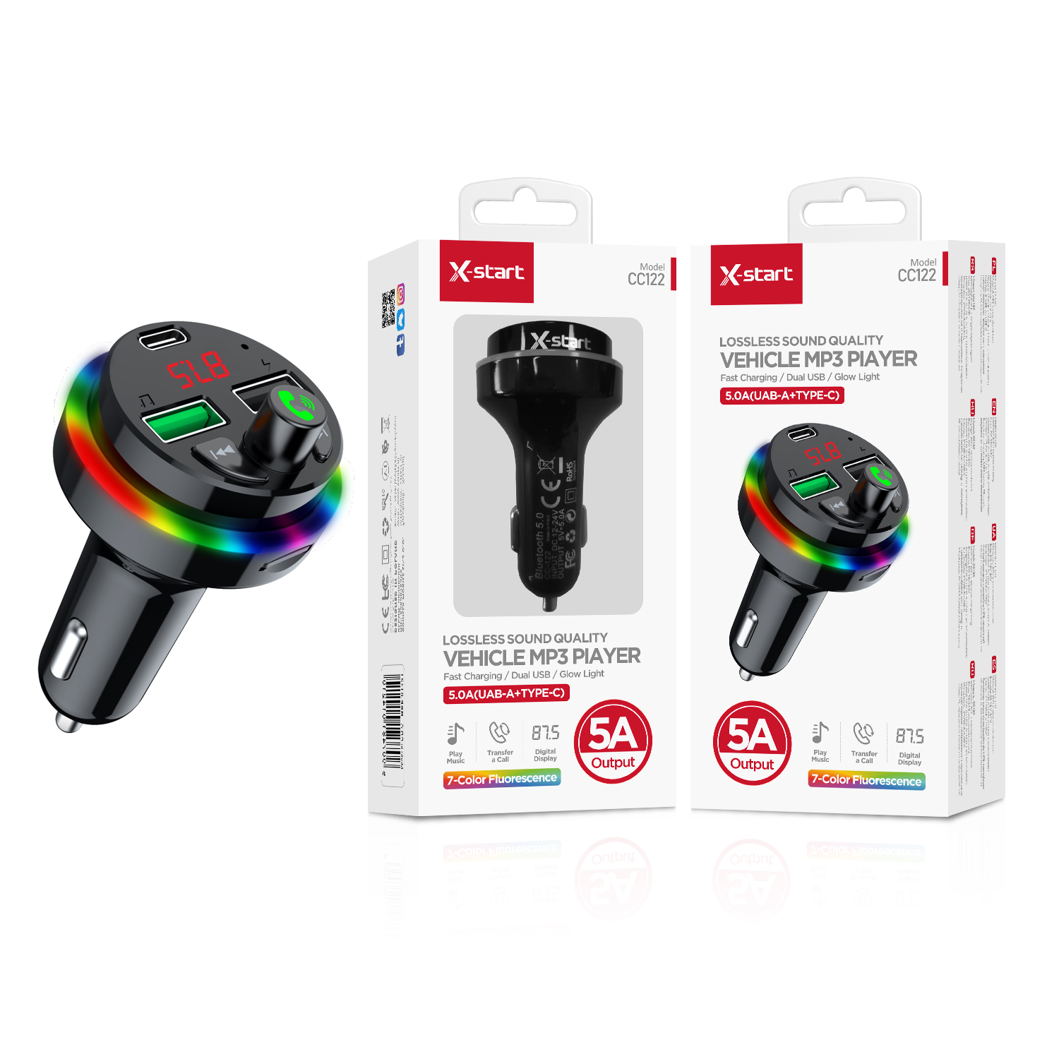 X-start CC122 黑色汽车蓝牙 MP3 播放器(PC+ABS),带双 USB 端口和 USB-A 输出,最大 5A FM 频率范围 87.5-108.0MHz,7 色渐变软灯,支持蓝牙适配器、音乐播放和 TF 卡播放。