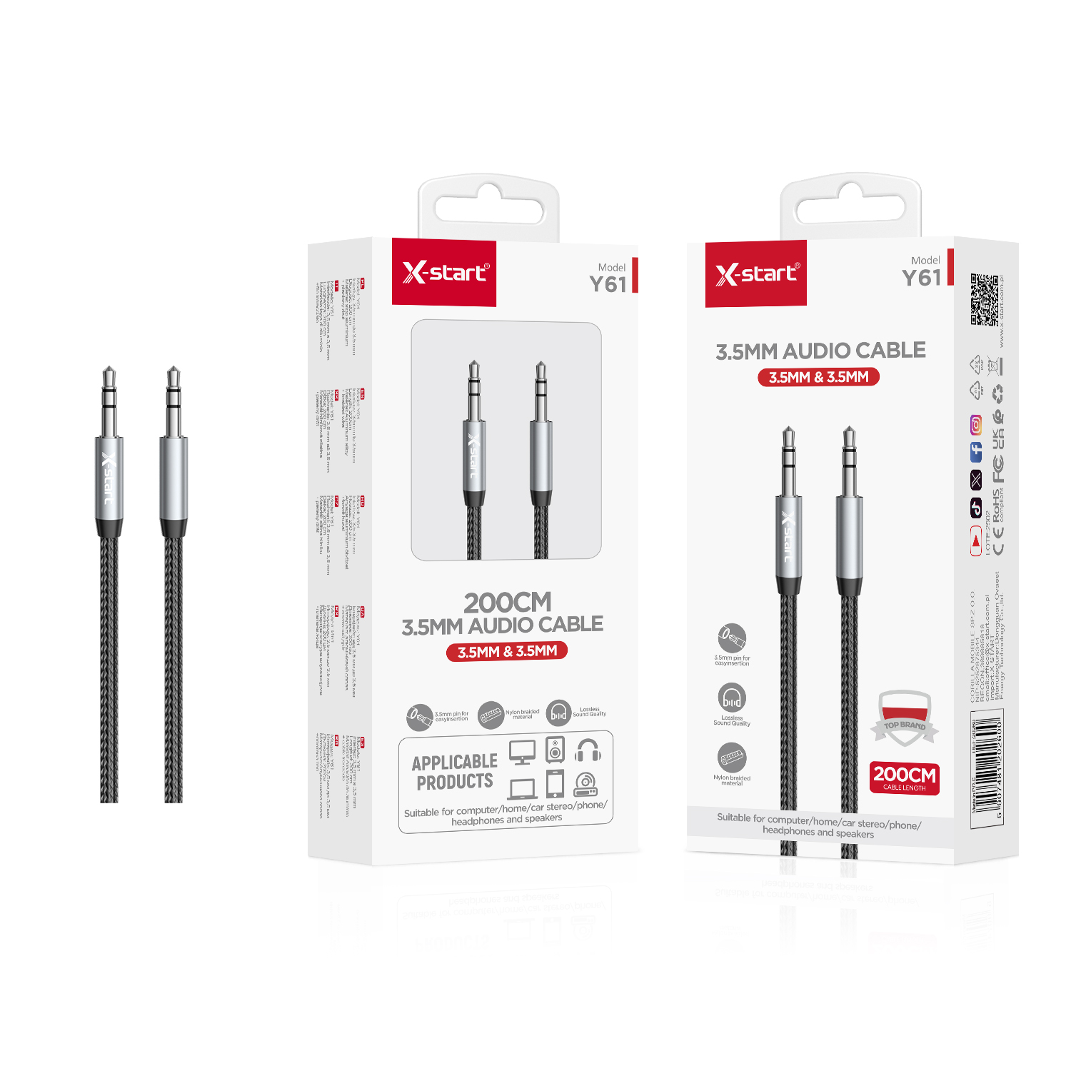 Y61 公座编织音频线Iron Gray Double 3.5mm Male Braided Audio Cable, 2m Length, Triple Pins, No Call Support, Braided Outer Sheath