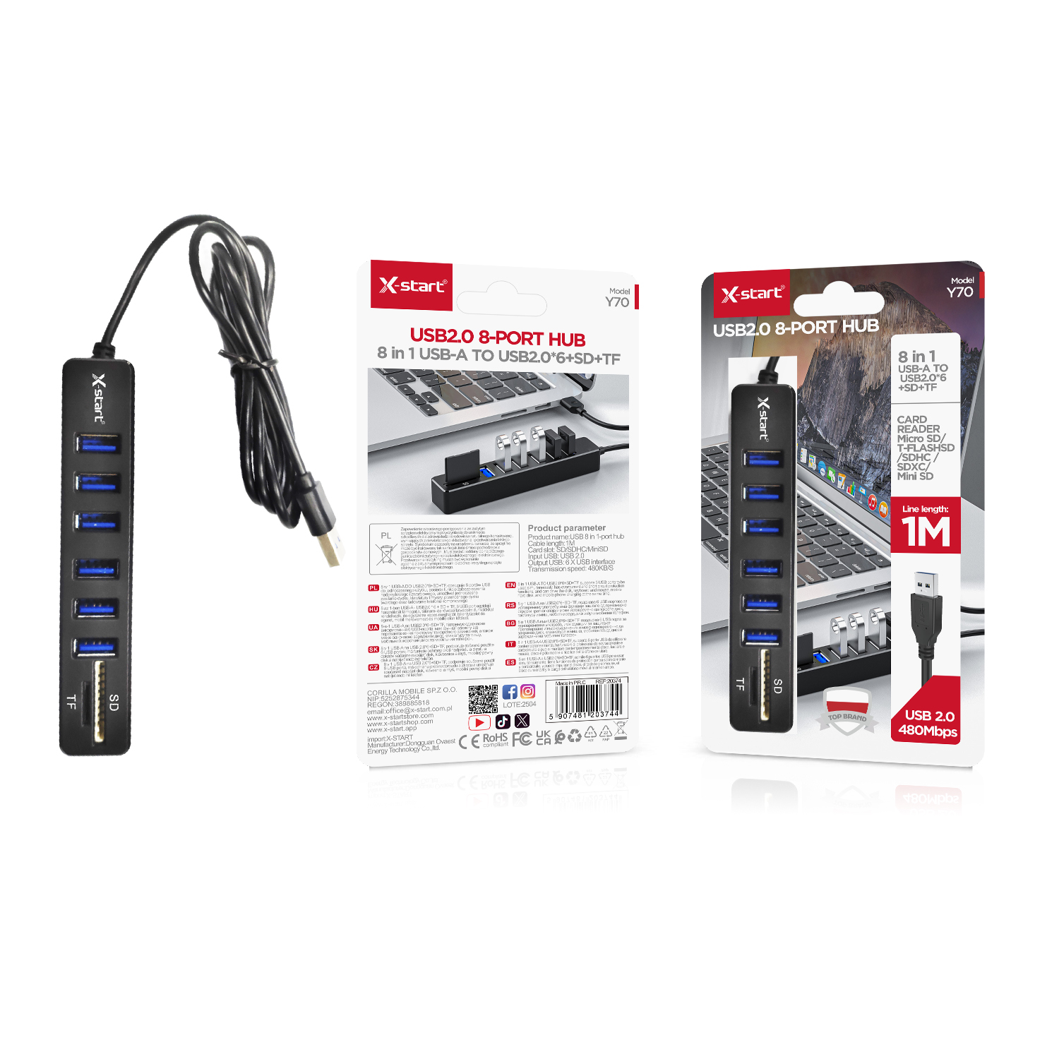 Y70 八合一拓展坞Black USB 2.0 8-in-1 Dock, 1-meter cable, 6 USB ports + SD card + TF card, 480Mbps, ABS shell