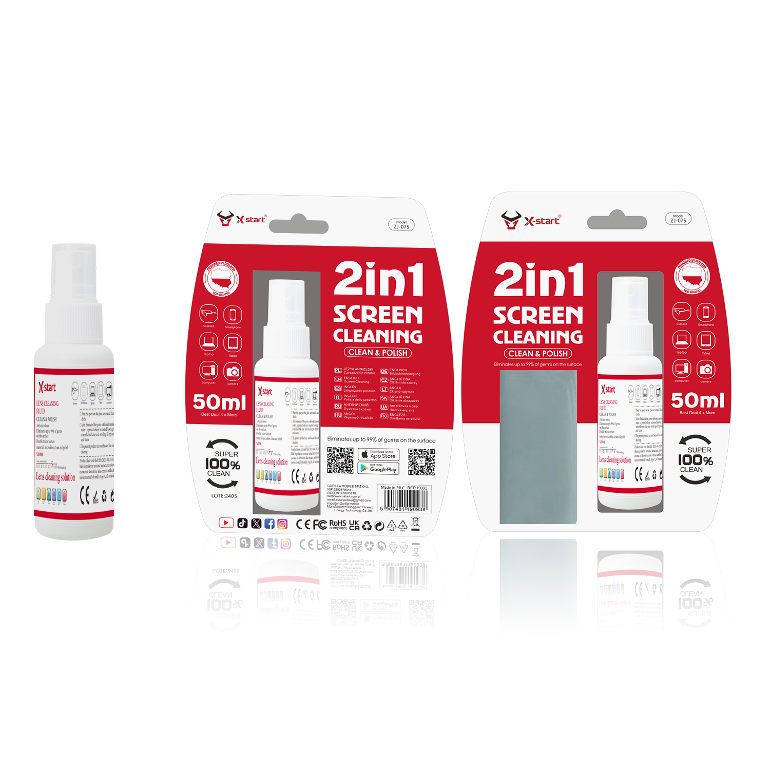 ZJ075 蓝色 2合1清洁套装:镜子清洁溶液50毫升,无尘可洗棉。适用于相机、平板电脑、显示器、眼镜等。