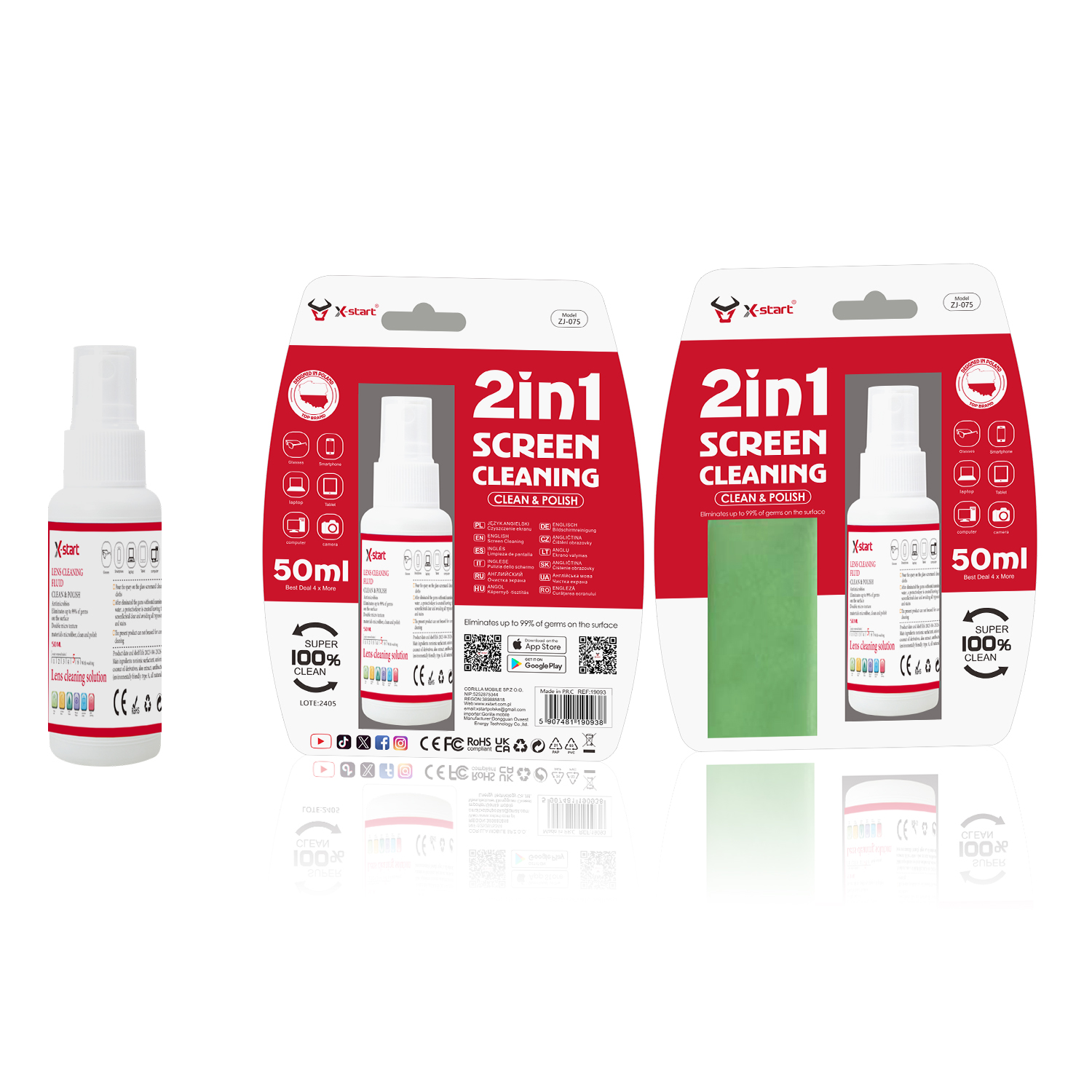 ZJ075 Green2合1清洁套装:镜子清洁溶液50毫升,无尘可洗棉。适用于相机、平板电脑、显示器、眼镜等。